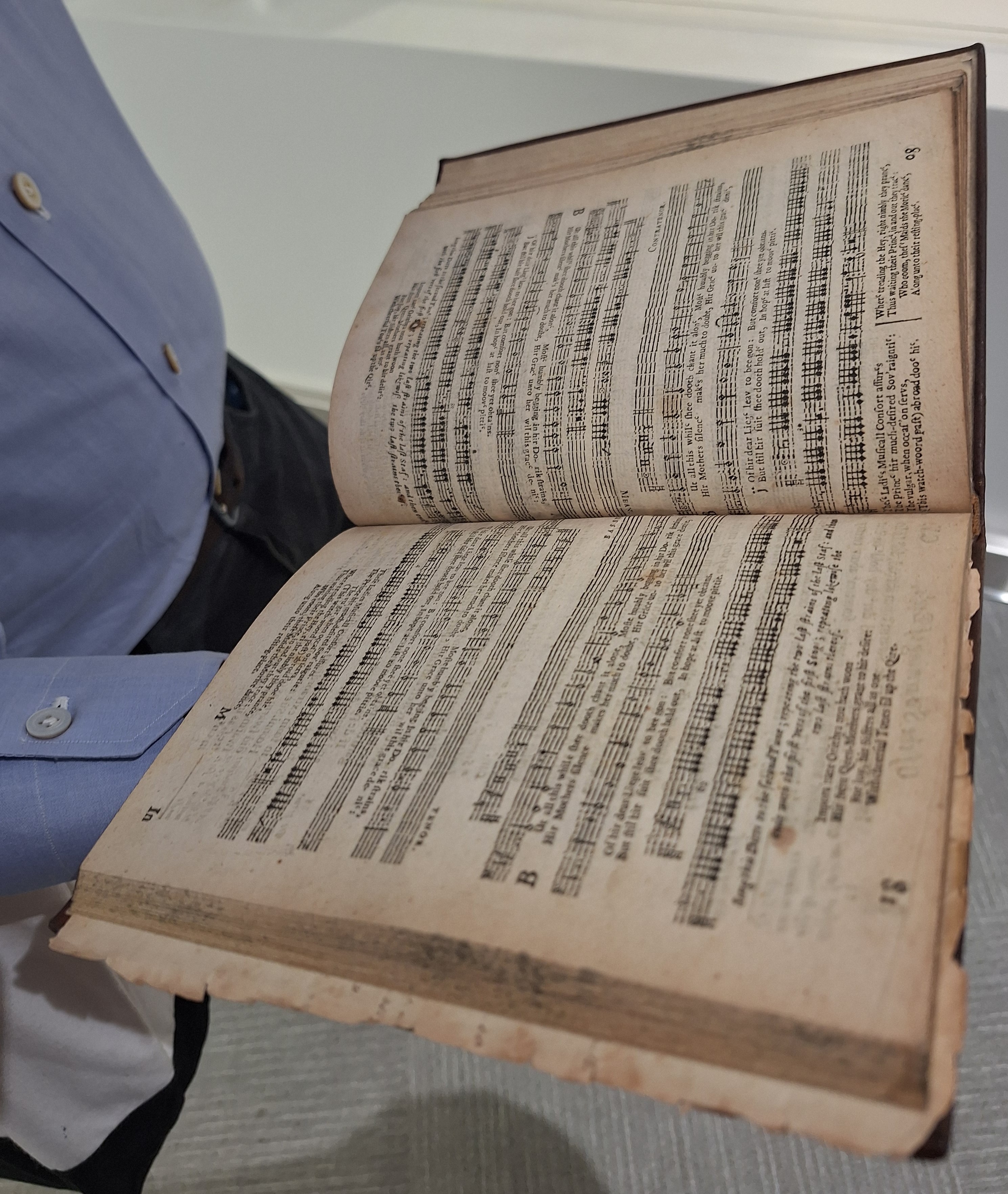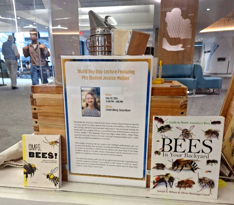 I’m so pleased to report that our performance was a worthy opening act for World Bee Day speaker Jess Mullins, and also a great kick-off for a remarkable library exhibit celebrating World Bee Day and UCSD’s official recognition as a Bee Campus. This effort to secure recognition by creating significant pollinator habitat on campus was spearheaded by Biological Sciences Associate Dean James Nieh, whose lab studies how stressors affect bee behaviors and bee communication (including waggle dances!). In addition to beautiful displays from the Nieh Lab and bee researcher James Hung, the exhibit contains antiquarian treasures from the collection of bee historian Joe Bray, including an original part-song score of Butler’s Melissomelos. And best of all, Joe brought his own complete, original edition of Butler’s The Feminie Monarchie with him to the event, so I got to see it in person, which was AMAZING!