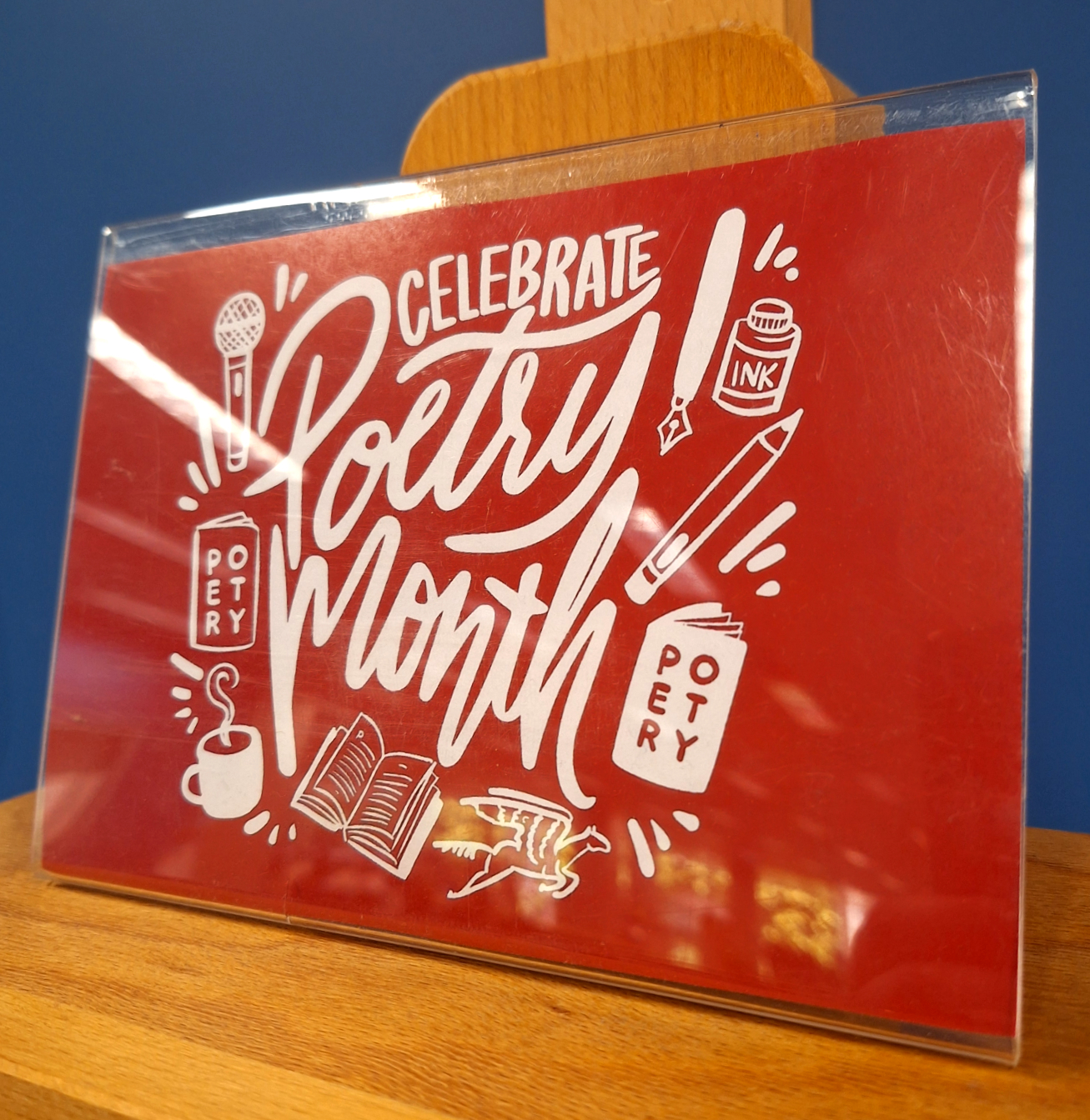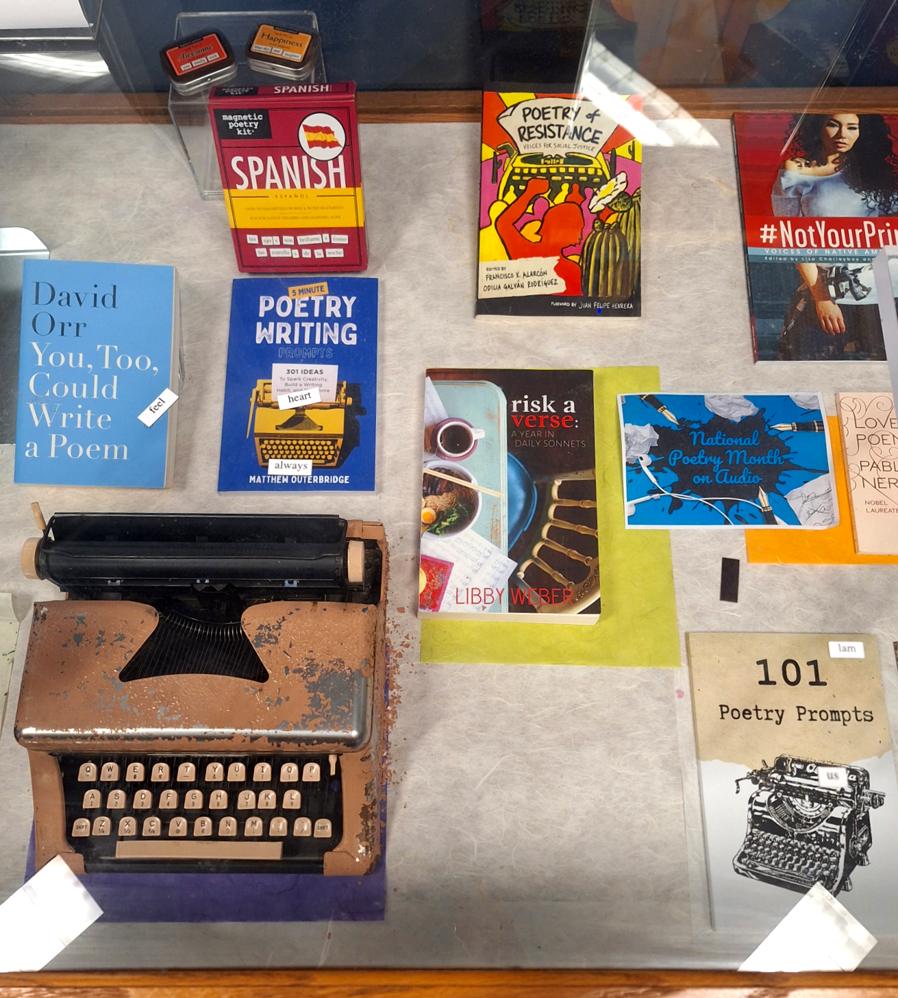 My sonnet book was also included in a National Poetry Month display at the mothership herself, (the Geisel Library) in a display of staff favorite poetry books from the library’s permanent circulating collection, alongside fun poetry-themed activities like haiku dice and magnetic poetry kits!