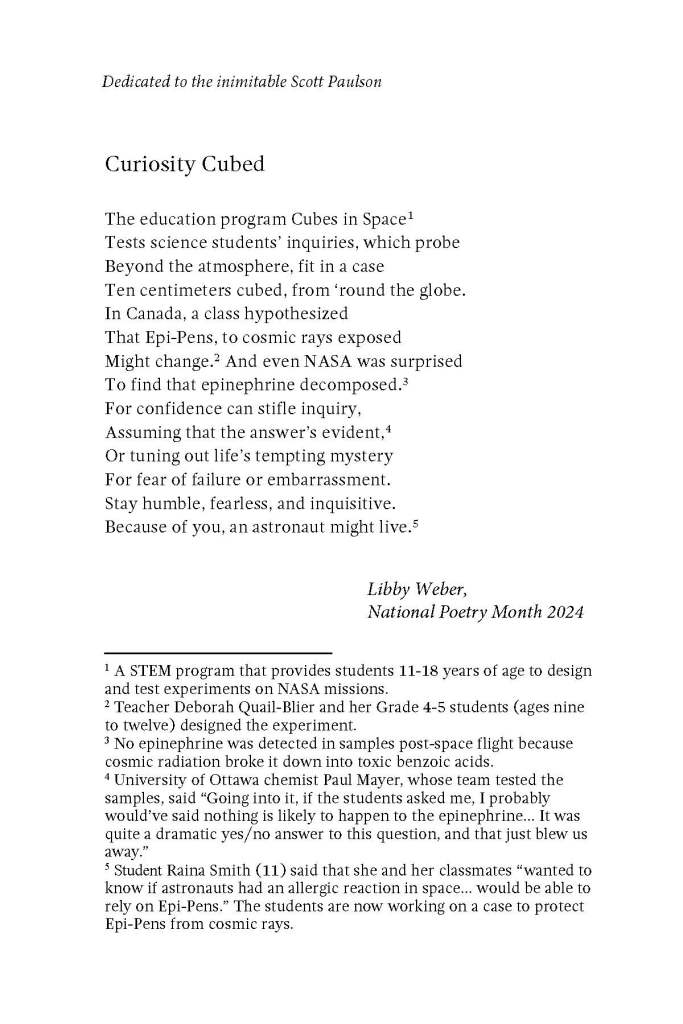 First, the Sally T. WongAvery Library on the Health Sciences campus of University of California San Diego hosted a National Poetry Month exhibit featuring poems on science and medicine, works written by health practitioners and scientists, new poems from young citizen-scientists, AND a brand-new sonnet, written by me! When asked to write on the topic of citizen science, I immediately thought of the Canadian students whose experiment showed that the active ingredient in Epi-Pens degrades when exposed to cosmic rays, so I wrote a sonnet about that! Readers of RISK A VERSE will of course be shocked to see that there are copious footnotes. (hee!)